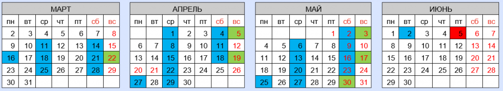 Голубым цветом отмечены дни занятий; зелёным цветом – дни контрольных работ.